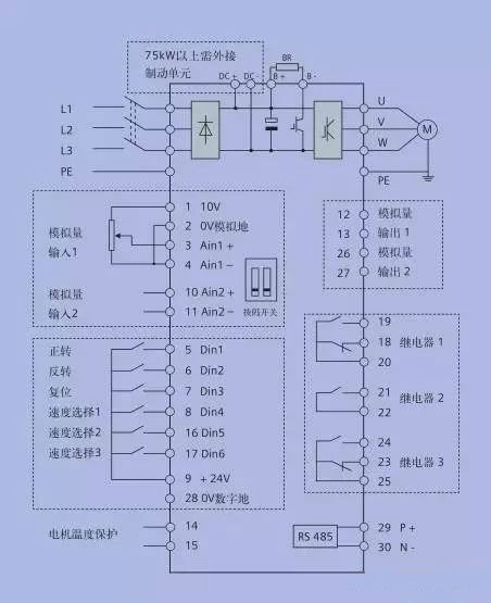 海利普變頻器主要由整流、濾波、逆變、驅(qū)動單元、制動單元、檢測單元微處理單元等組成。采用交-直-交工作原理,首先將三相交流電經(jīng)整流模塊變換成直流,再進行濾波后,通過IGBT等其它電力電子器件逆變成頻率和電壓均可變的三相交流電供電機使用。同時,通過IGBT的開斷調(diào)整輸出電源的頻率和電壓,從而達到調(diào)速、節(jié)能的作用。以下是海利普各系列變頻器的接線示意圖。