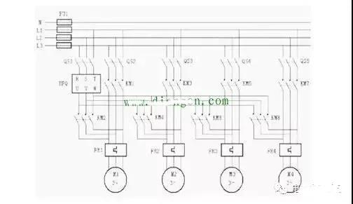 4、用一臺通用變頻器帶多臺電機時除了使電動機運行的總電流小于通用變頻器的額定電流外,還至少要計算一臺電動機起動電流的影響,以避免變頻器過電流跳閘。一拖多如下圖: