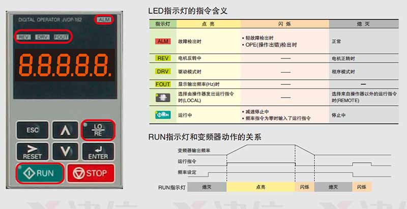 - 發(fā)生“故障”時,LED 操作器上顯示的文字“點亮”,ALM 指示燈也“點亮”。